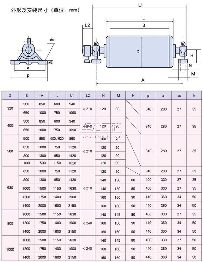 YDB-h隔爆型油冷式電動(dòng)滾筒基本參數(shù)表、外形尺寸表、安裝尺寸