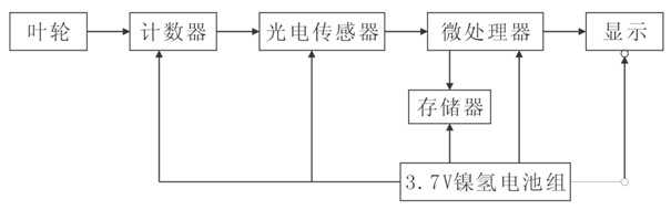 測(cè)量時(shí),因?yàn)槿~輪旋轉(zhuǎn)對(duì)光電傳感器形成遮擋,每遮擋一次就產(chǎn)生一個(gè)光脈沖信號(hào),脈沖信號(hào)經(jīng)計(jì)數(shù)器傳送到微處理器進(jìn)行運(yùn)算處理后,經(jīng)顯示器顯示或存入存儲(chǔ)器保存。