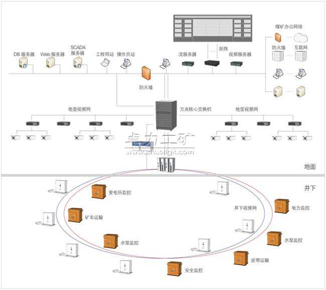 全礦井綜合自動化包括綜合自動化平臺、全礦井網(wǎng)絡(luò)、視頻監(jiān)控系統(tǒng)、調(diào)度中心拼接幕墻、機(jī)房等組成部分,通過工業(yè)以太環(huán)網(wǎng)將監(jiān)控子系統(tǒng)和視頻系統(tǒng)高度集成到調(diào)度中心。